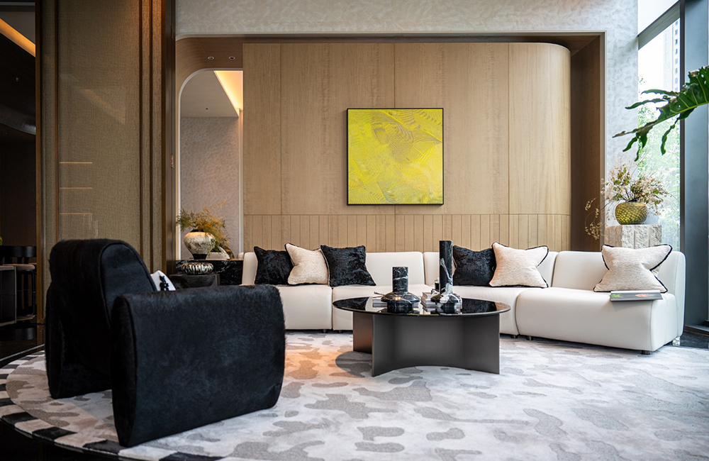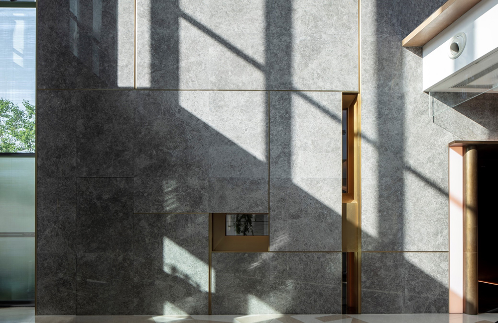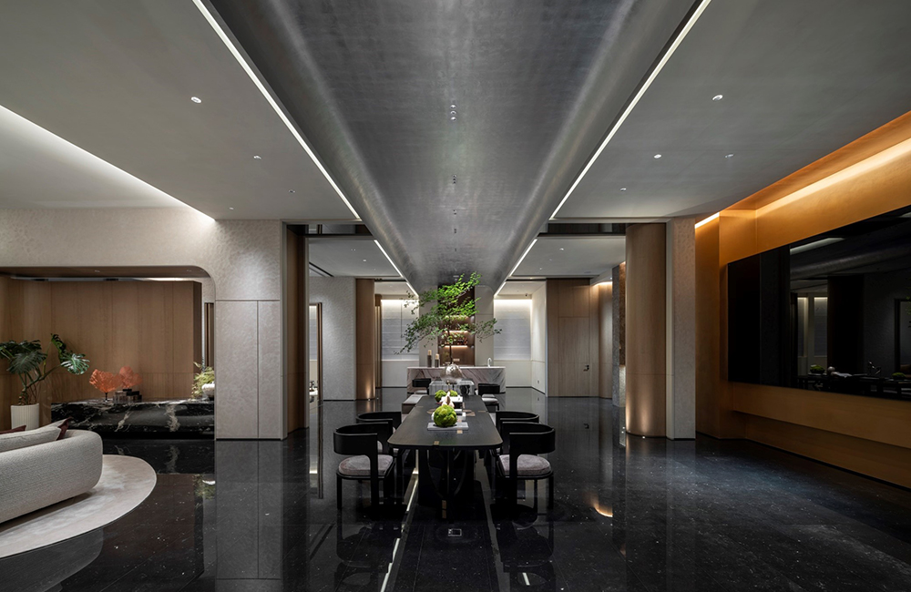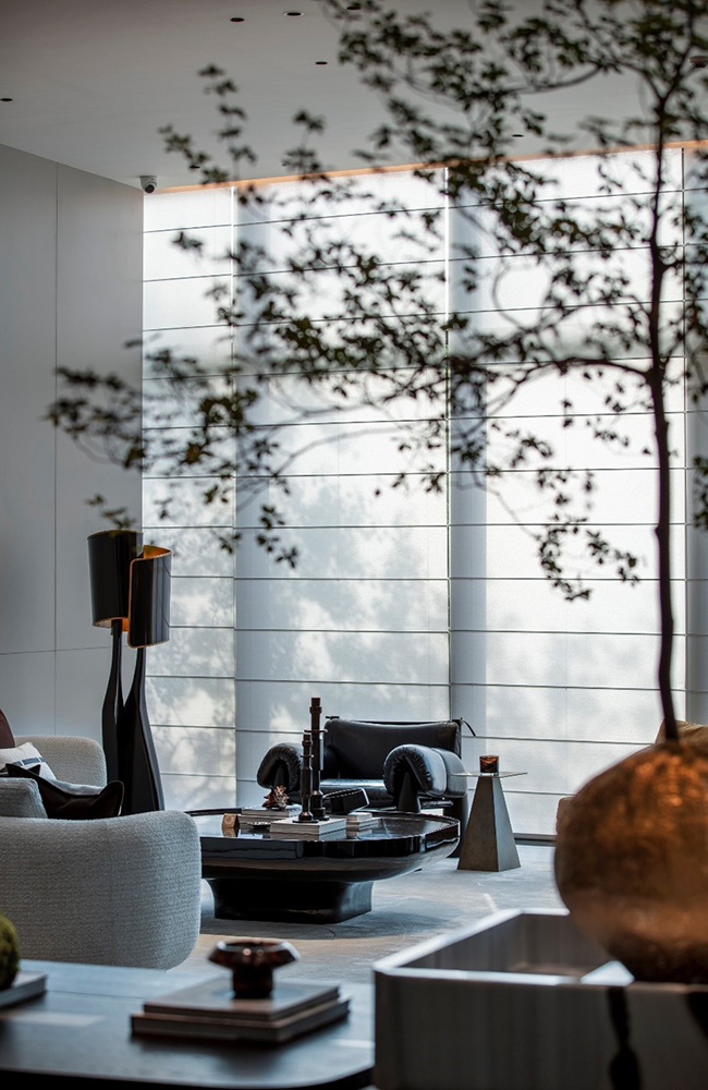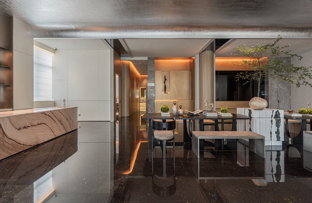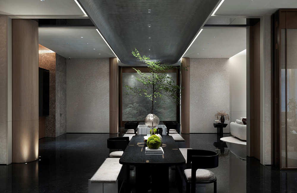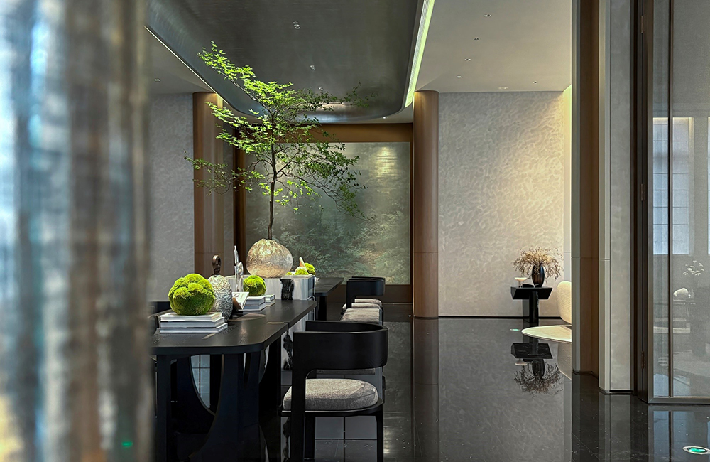 Rough stone and gleaming metal, soft textiles and flowing reflective surfaces weave a visual rhythm, gently mirroring the quiet dialogue between the outdoor courtyard and the interior showcase.