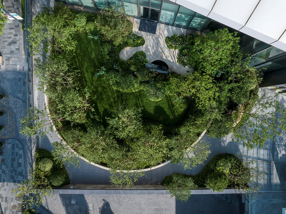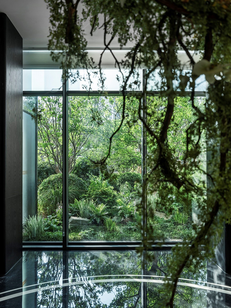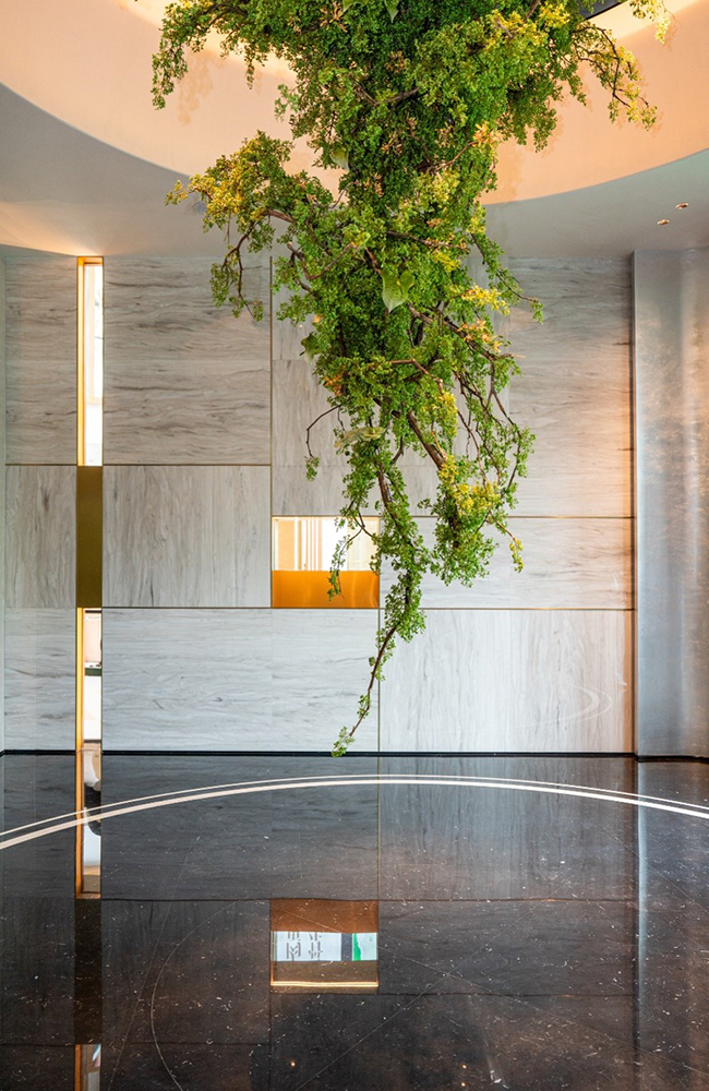 The circular foyer becomes an indoor courtyard, leading the gaze outward. Overhead greenery descends like a suspended curtain, its softness set against the groundcover beyond, gently muting the noise of the city.