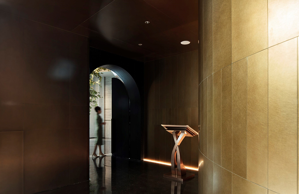 Hand-polished Malaysian lacquer walls in earthy tones evoke warmth and calm. In the core space, a ceiling of hand-laid silver leaf subtly glimmers, marking the shift from dramatic tension to a natural, comfortable atmosphere.
